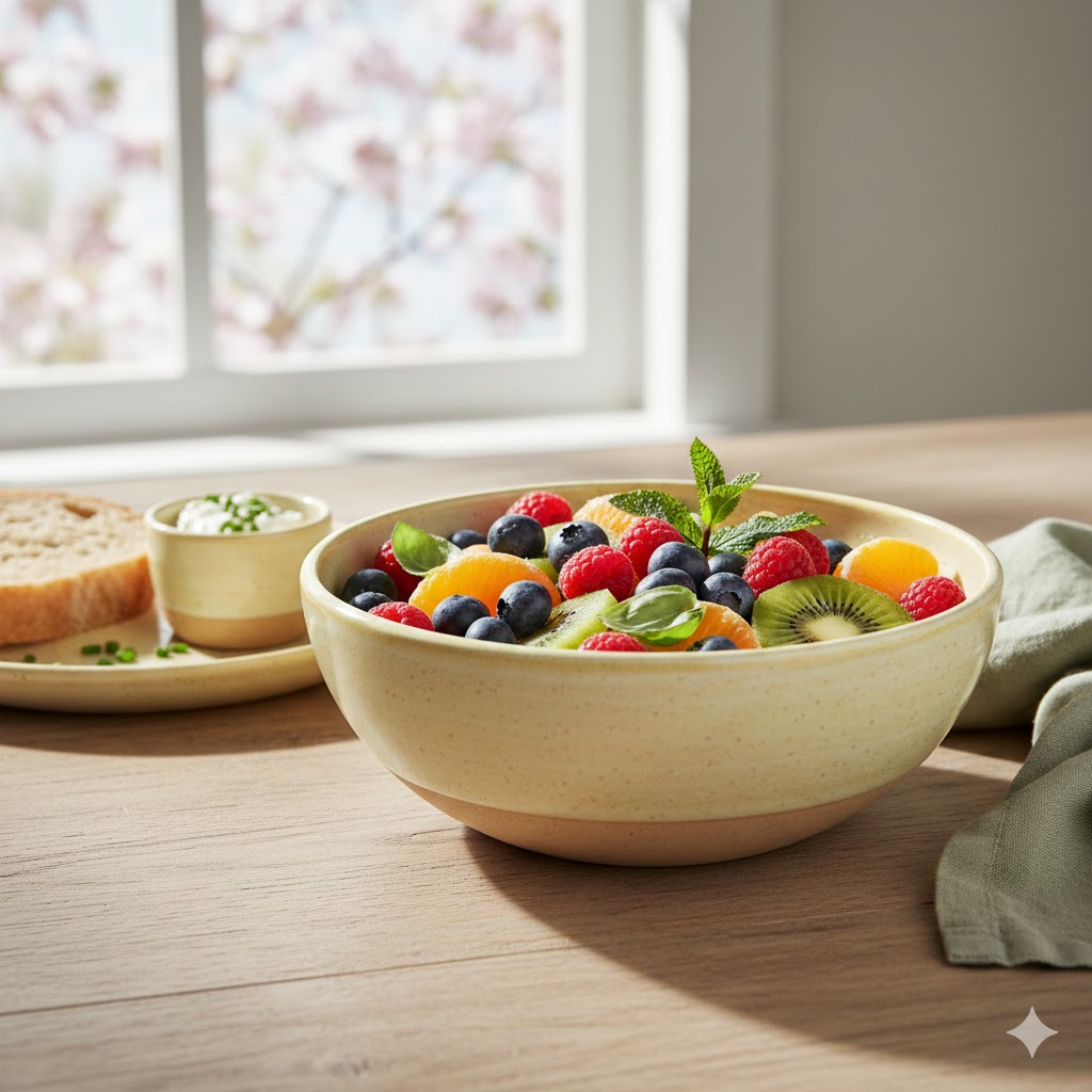 ☀️ Čerstvé ovoce: Představte si v ní naskládané lesní plody (borůvky, maliny, ostružiny), šťavnaté jahody, tmavé třešně nebo sytě oranžové mango. Jejich výrazné barvy budou na jemném citronovém podkladu doslova zářit.
