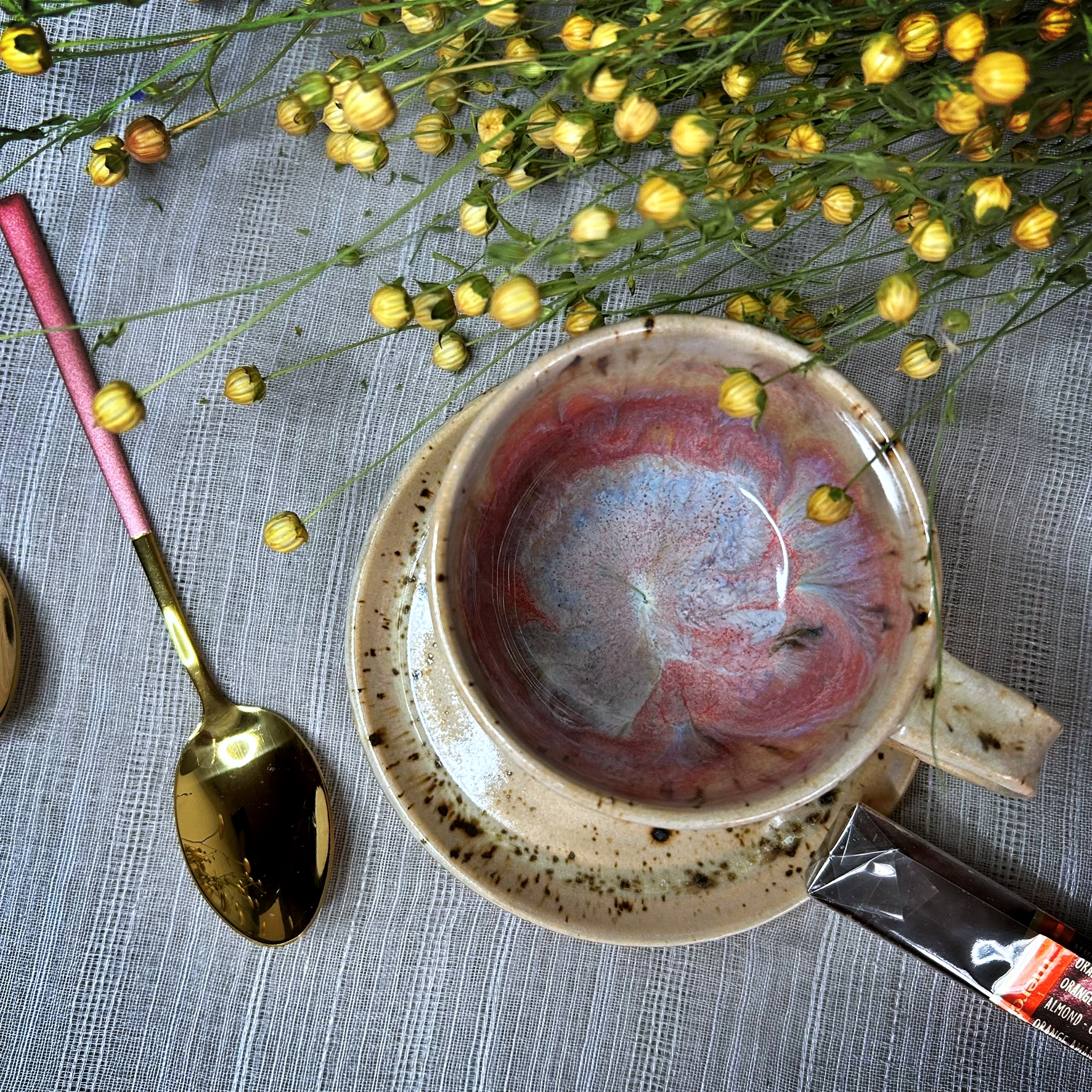 Kameninový hrneček s podšálkem z řady Bloom vyniknou na každém stole. Místy jemně, místy sytě růžové okraje přecházejí v pomyslný květ uvnitř misky – unikátní kresbu vytvořenou samotnou přírodou při snoubení glazur v žáru pece. Každý květ je v každé tvorbě této řady jedinečný.