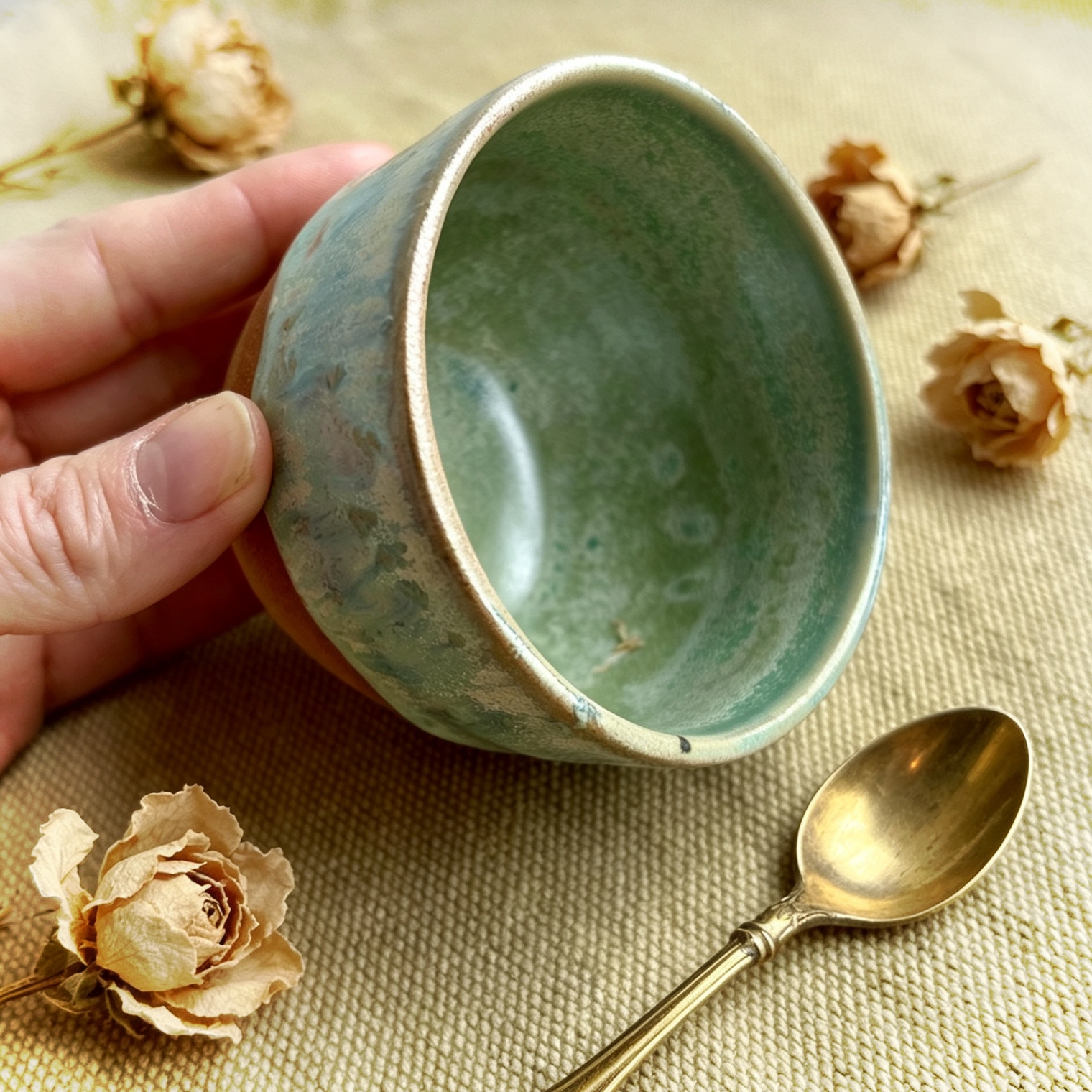 Tento kameninový kalíšek z řady Matchasalt zaujme svým vnitřním prostorem, který vyplňuje hluboká zelená glazura s bohatými efekty a vyloženě si říká o šálek zeleného čaje. Je univerzální i elegantní. Přirozeně zapadne do rustikálního prostředí a zároveň krásně vynikne v čistě elegantním interiéru, s nímž vytváří nenápadný kontrast.