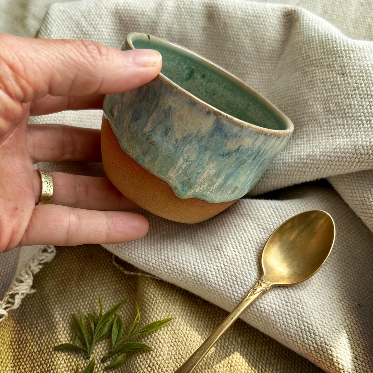 Kalíšek bez ouška, určený pro vychutnání hřejivé chvilky, má průměr 8-9 cm, výšku 5,5-6 cm a objem dle Vaší volby 170 ml. Díky přímému doteku bez ouška vás příjemně zahřeje teplem čaje a nabídne uklidňující atmosféru. Je ideální pro šálek zeleného čaje a laděn do lesklejších tónů zeleného čaje a světlé země.