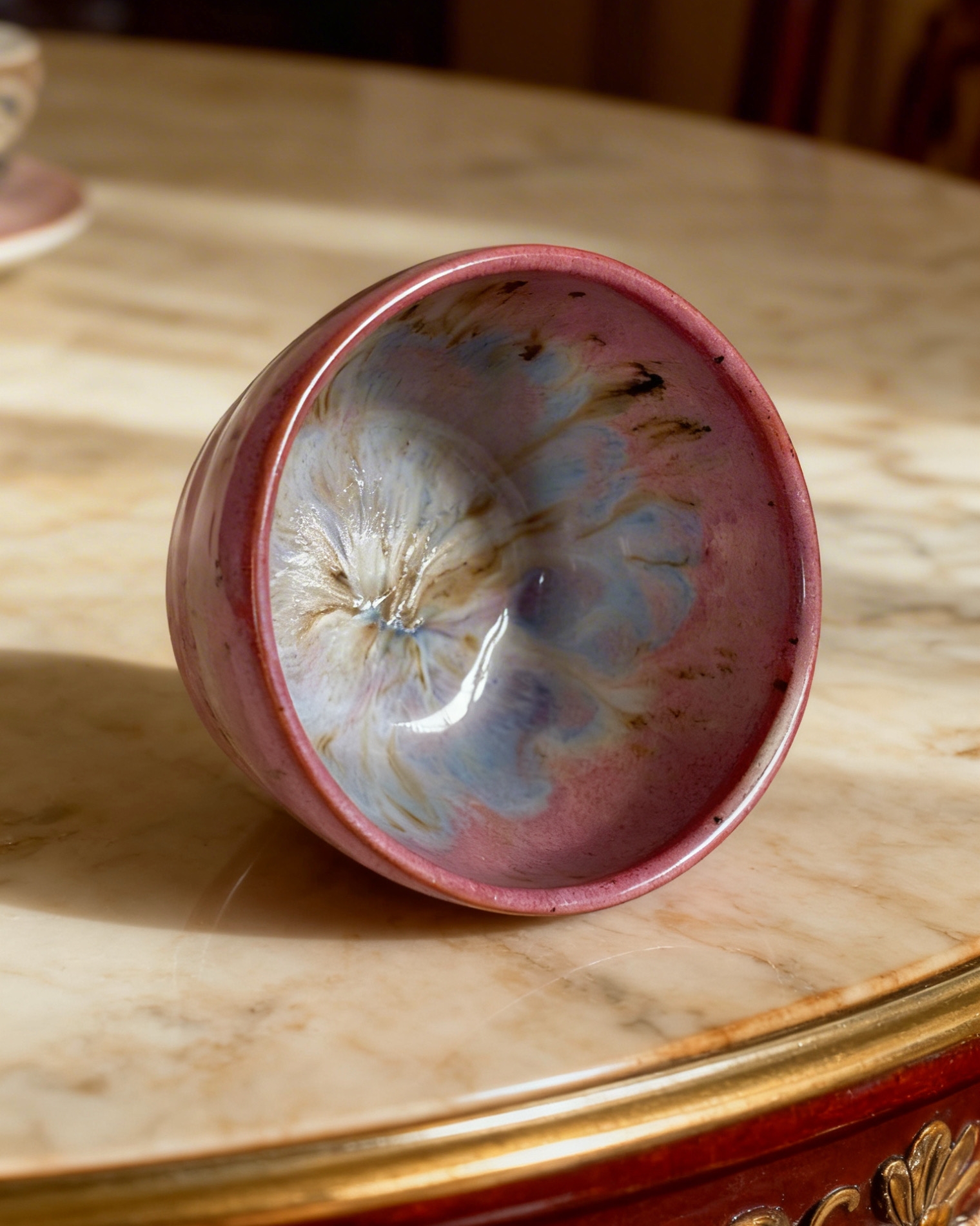Kamenina z řady DreamBloom má místy jemně, místy sytě růžové okraje, které přecházejí v „květ“ uvnitř misky – unikátní kresbu, kterou vytvořila sama příroda v žáru pece při setkání kombinací glazur. Žádné dva kalíšky nejsou stejné; každá nese svůj vlastní, neopakovatelný otisk snoubení glazur.