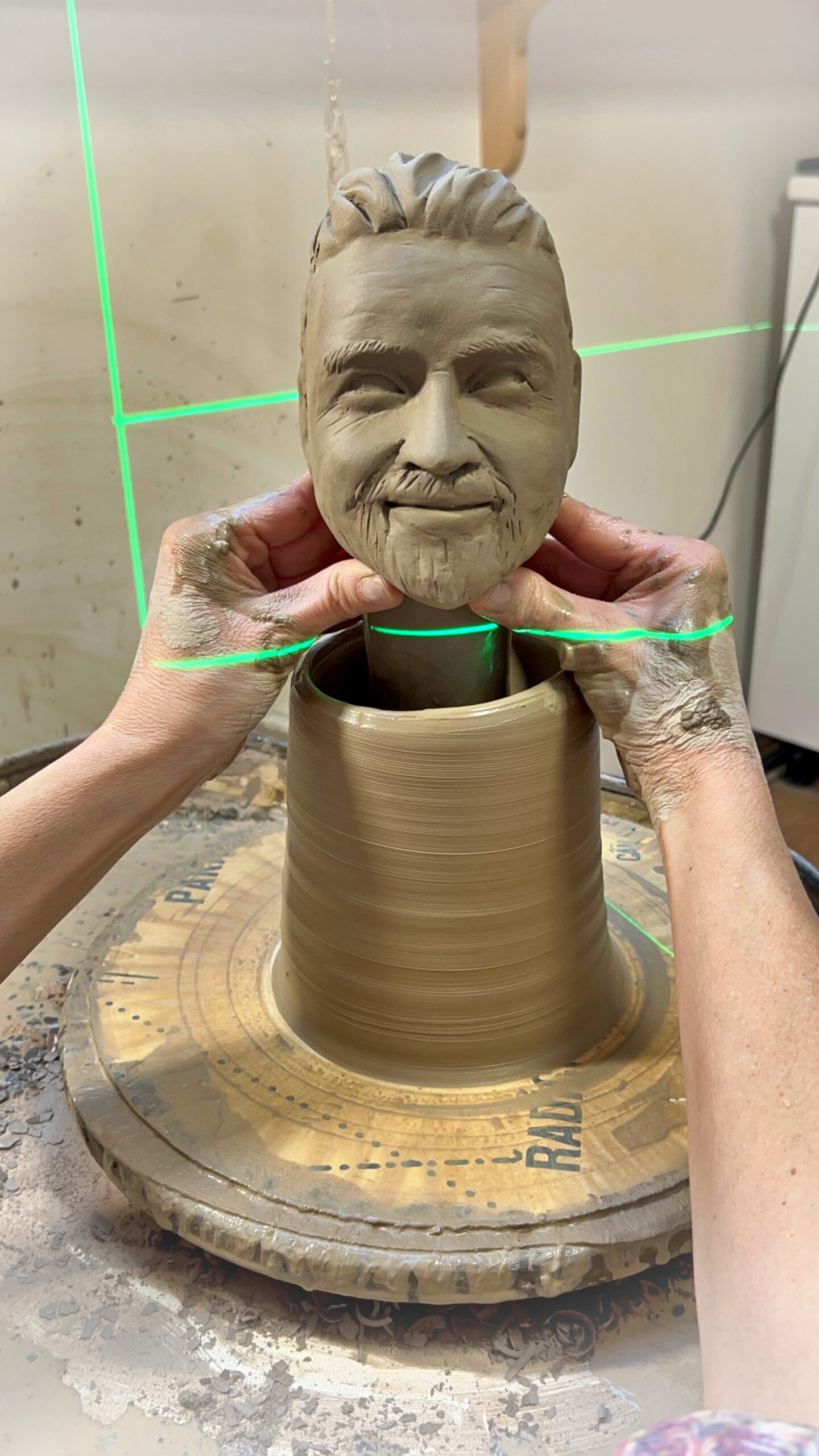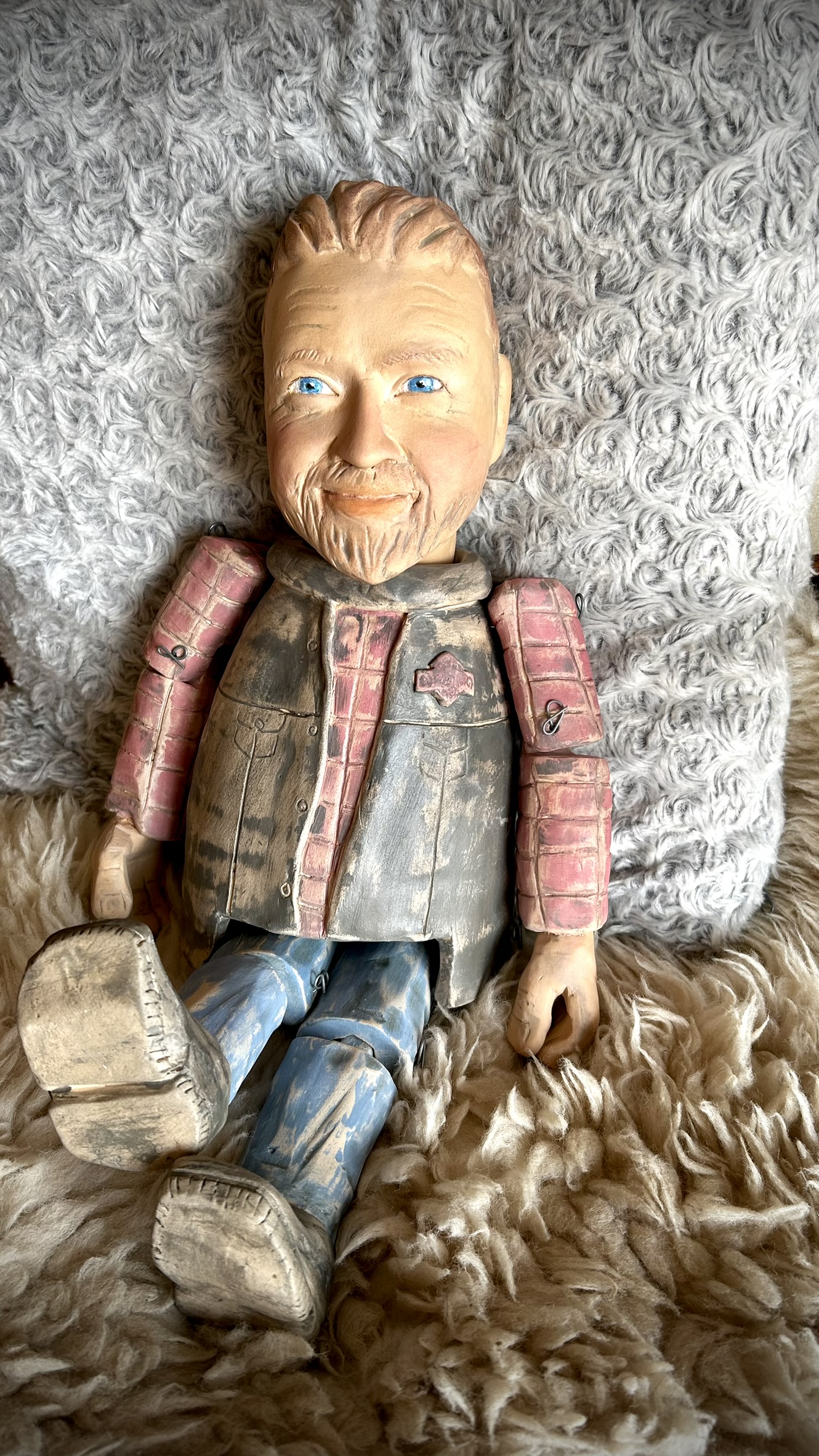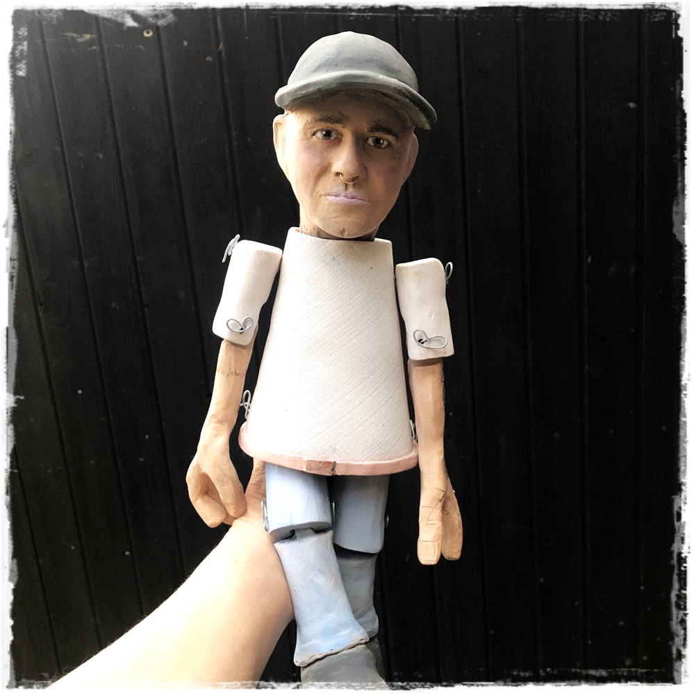 Základ těla točím na hrnčířském kruhu. Tento tradiční postup dodává loutce na opravdovosti – není to jen figura, ale poctivý kus keramiky. K barvení používám převážně barevné hlíny, nikoliv akrylové barvy či laky. Záměrně se vyhýbám celistvému lesku, který působí na velkých věcech až kýčovitě. Barevná nejednotnost a místa „setření“ – odhalení keramiky jsou tvůrčím záměrem – loutka díky tomu získává hloubku, přirozený vzhled a duši ručního díla.