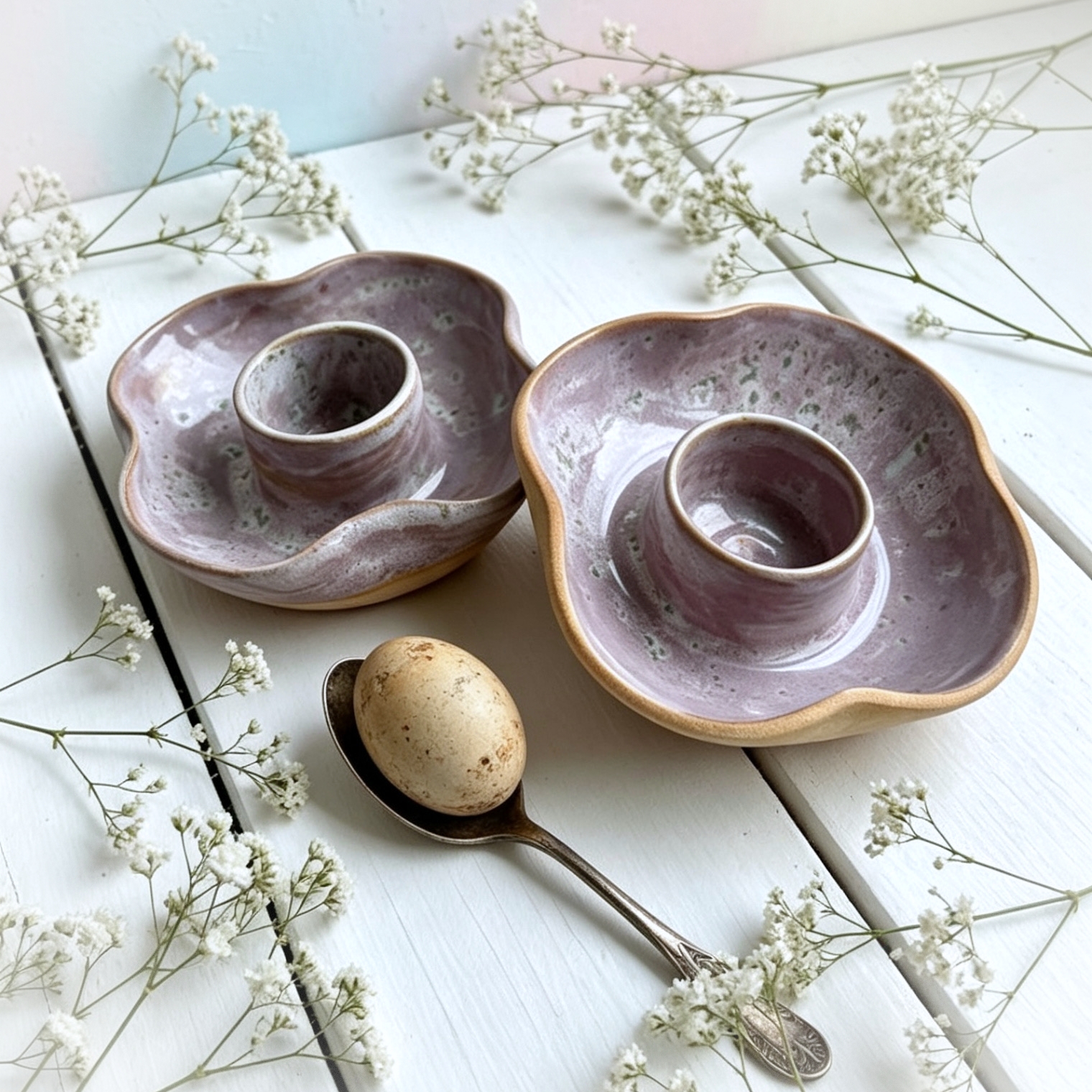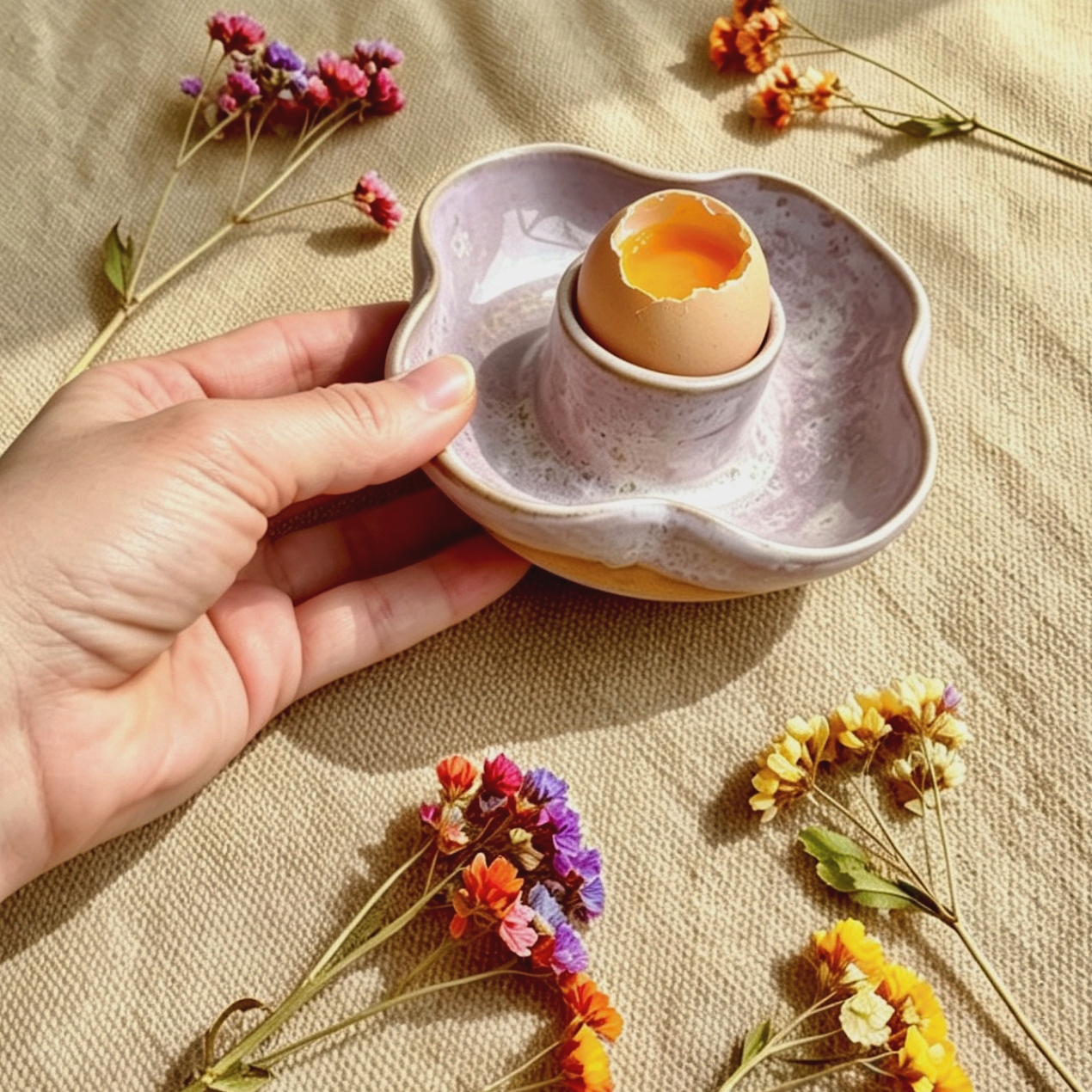 Co takhle snídani nebo večeři, která nikam nespěhá. Fialkové mističky z řady Lilasalt jsem vytvořila pro všechny, kteří si chtějí vychutnat vajíčko naměkko v doprovodu něžného designu a poctivého materiálu. Jemná barva v kombinaci s přiznanou strukturou hlíny působí na stole velice něžně a romanticky.